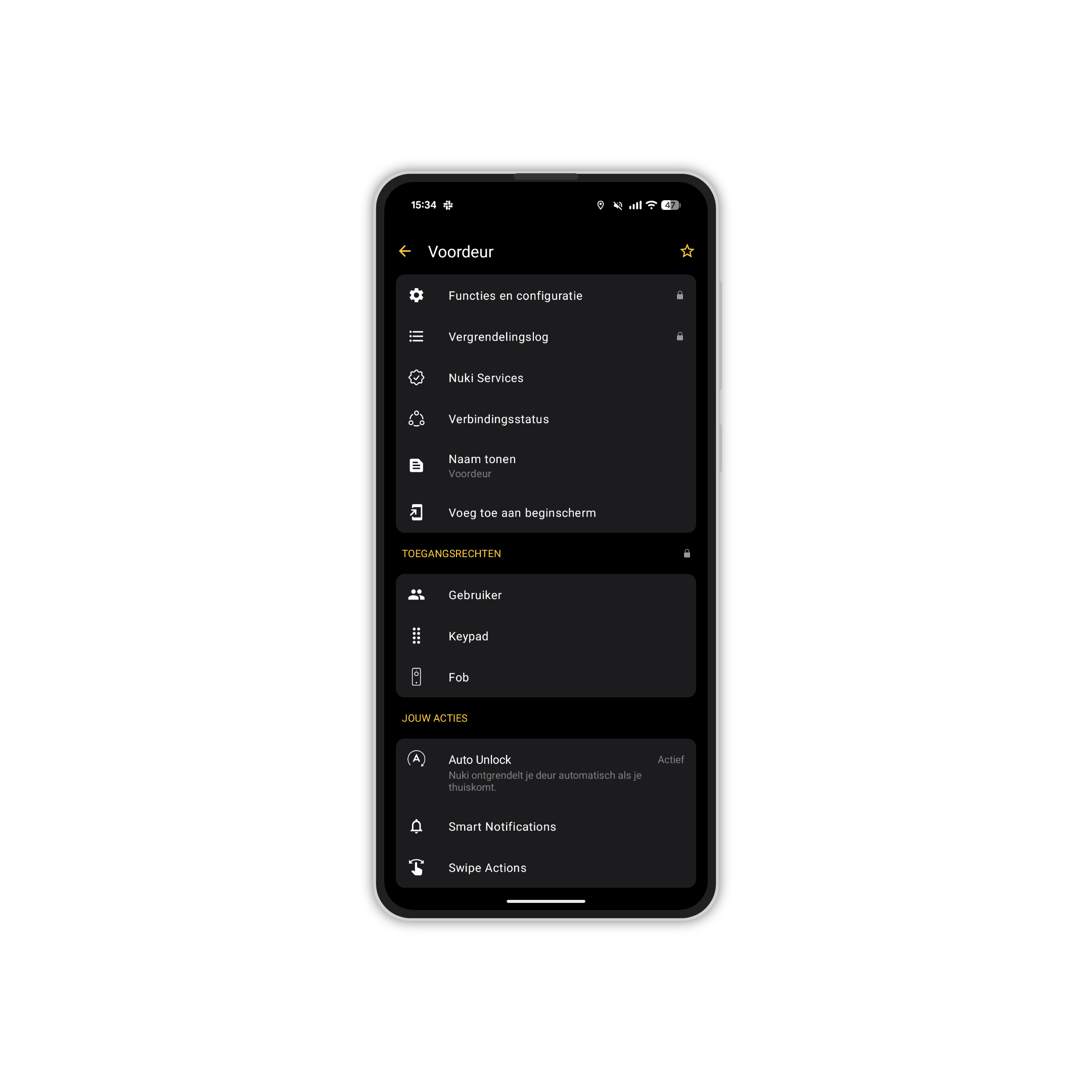 De app van Nuki is eigenlijk de belangrijkste hub van het slot. Er zit natuurlijk een fysieke knop op het slot, maar verder gebeurt alles in de app. Handmatig openen, instellingen aanpassen en de link maken met Google Home. Dat laatste gaat net als alles met Nuki ontzettend makkelijk. Het is een kwestie van even zoeken naar Nuki in de Home-app en toevoegen. Vervolgens stel je een persoonlijke code in die je moet invullen wanneer je een slot met je stem wilt openen, wat mij betreft een handig extra beveiliging.